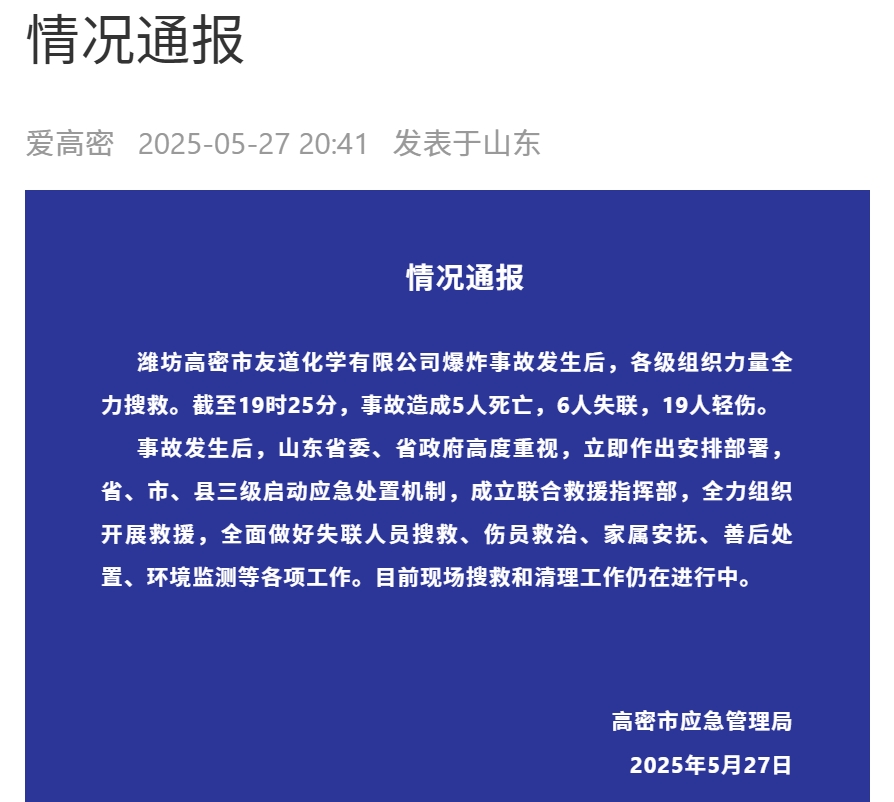 濰坊高密市友道化學有限公司爆炸事故發生後,各級組織力量全力搜救。截至19時25分,事故造成5人死亡,6人失聯,19人輕傷。