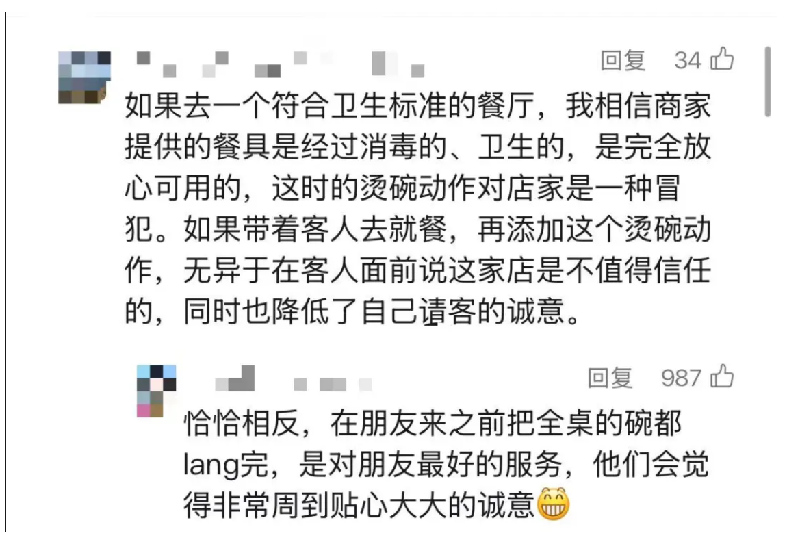反對燙碗的聲音也不少,部分網友從科學角度出發認為幾秒鐘的過熱水根本達不到殺菌效果。若餐具本身乾淨,燙一下無濟於事。反而可能因操作不當造成二次污染,是典型的形式主義和心理安慰。