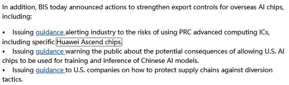 與此同時,美國政府推出了三個政策指導,加強對中國AI相關的出口管制,其中,針對華為昇騰(Ascend)芯片的“全球通緝”最引人矚目。將此舉與其中東佈局連在一起看,很明顯,特朗普的戰略目標是“搶市佔”,至於能否將中國製芯片限制在中國市場,那是其次,因為現實中做不到。前者是攻擊,後者是防守,大家都知道特朗普性喜攻擊。