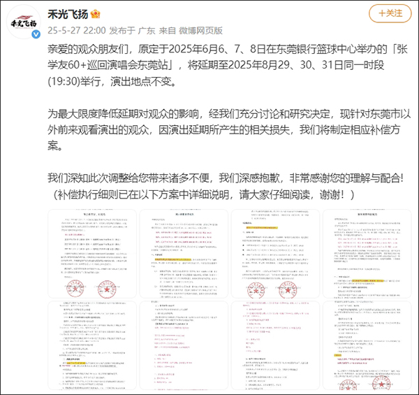 5月27日,“張學友60+巡迴演唱會東莞站”主辦方廣州禾光飛揚文化傳媒有限公司@禾光飛揚 發佈公告稱,原定於2025年6月6、7、8日在東莞銀行籃球中心舉辦的“張學友60+巡迴演唱會東莞站”,將延期至2025年8月29、30、31日同一時段(19:30)舉行,演出地點不變。