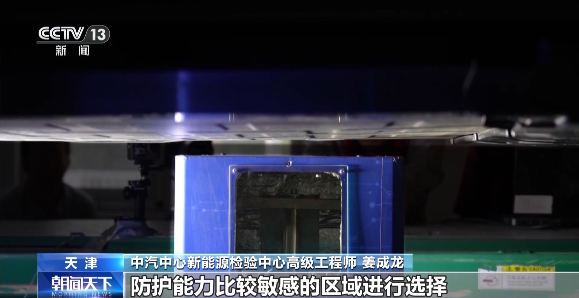 總枱央視記者 羅宏進:這裏是電池包底部安全碰撞試驗的現場,在試驗當中30毫米的鋼製撞擊頭,將以150焦耳能量撞擊電池包上面的風險點,像這樣的風險點在電池包底部共選取了前、中、後三處。