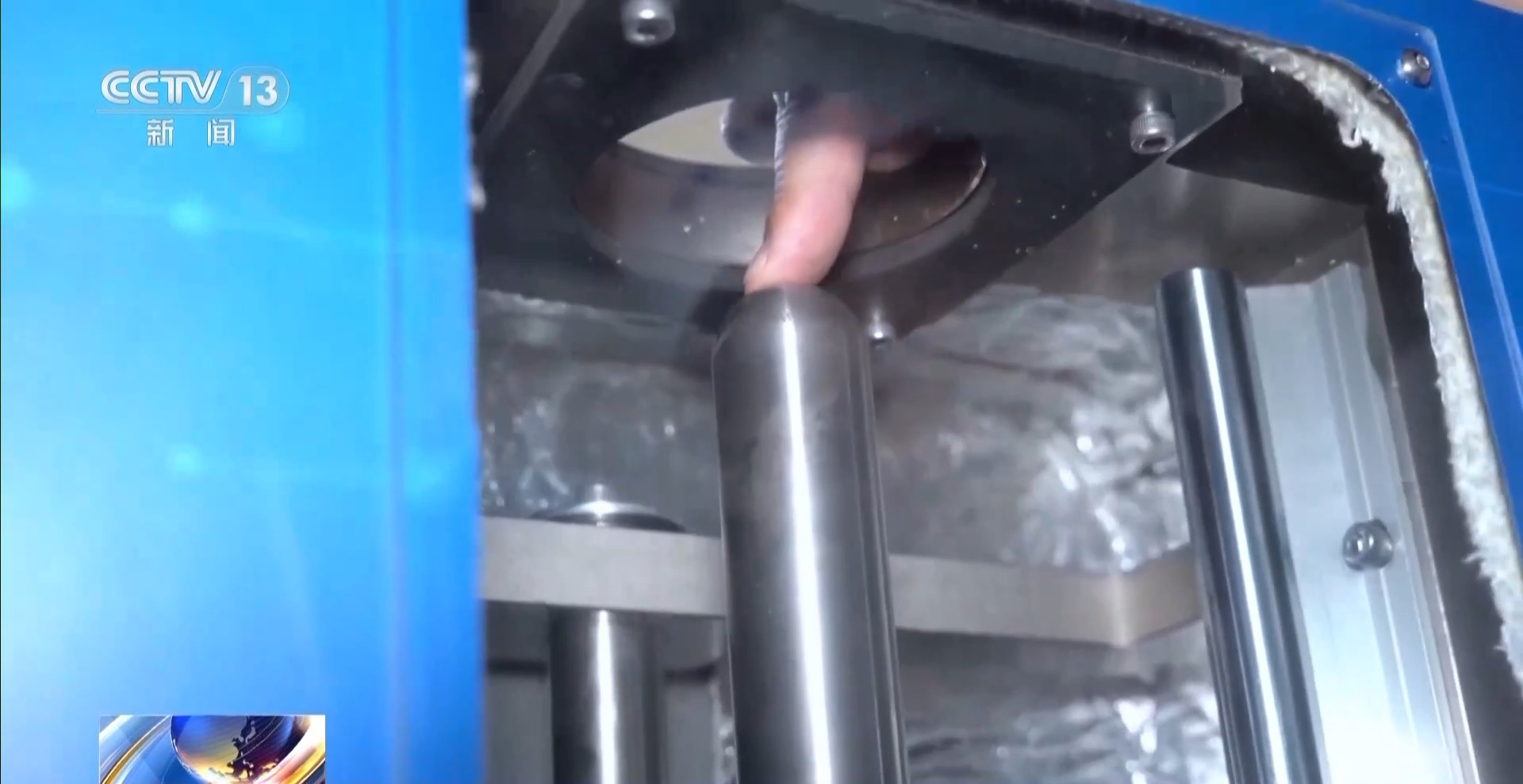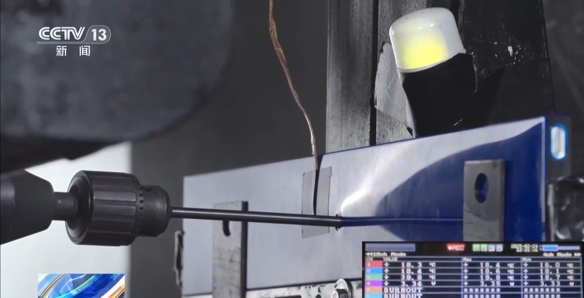總枱央視記者 羅宏進:在電池包的針刺試驗中,我們可以看到,這個5毫米鋼針將以每秒1毫米的速度刺向目標電芯,大約經過50秒的時間,目標電芯將被刺破。