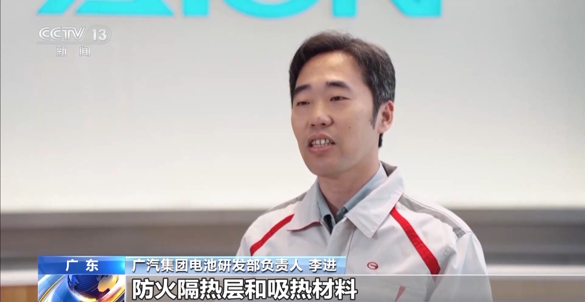 廣汽集團電池研發部負責人 李進:我們通過防火隔熱材料把電池包分割成多個“安全艙”,電芯熱失控時,防火隔熱層和吸熱材料會將熱量鎖死在“安全艙”裏面,並通過速冷技術快速將熱量帶走,對熱失控電芯進行降温,絕不連累其他電池。