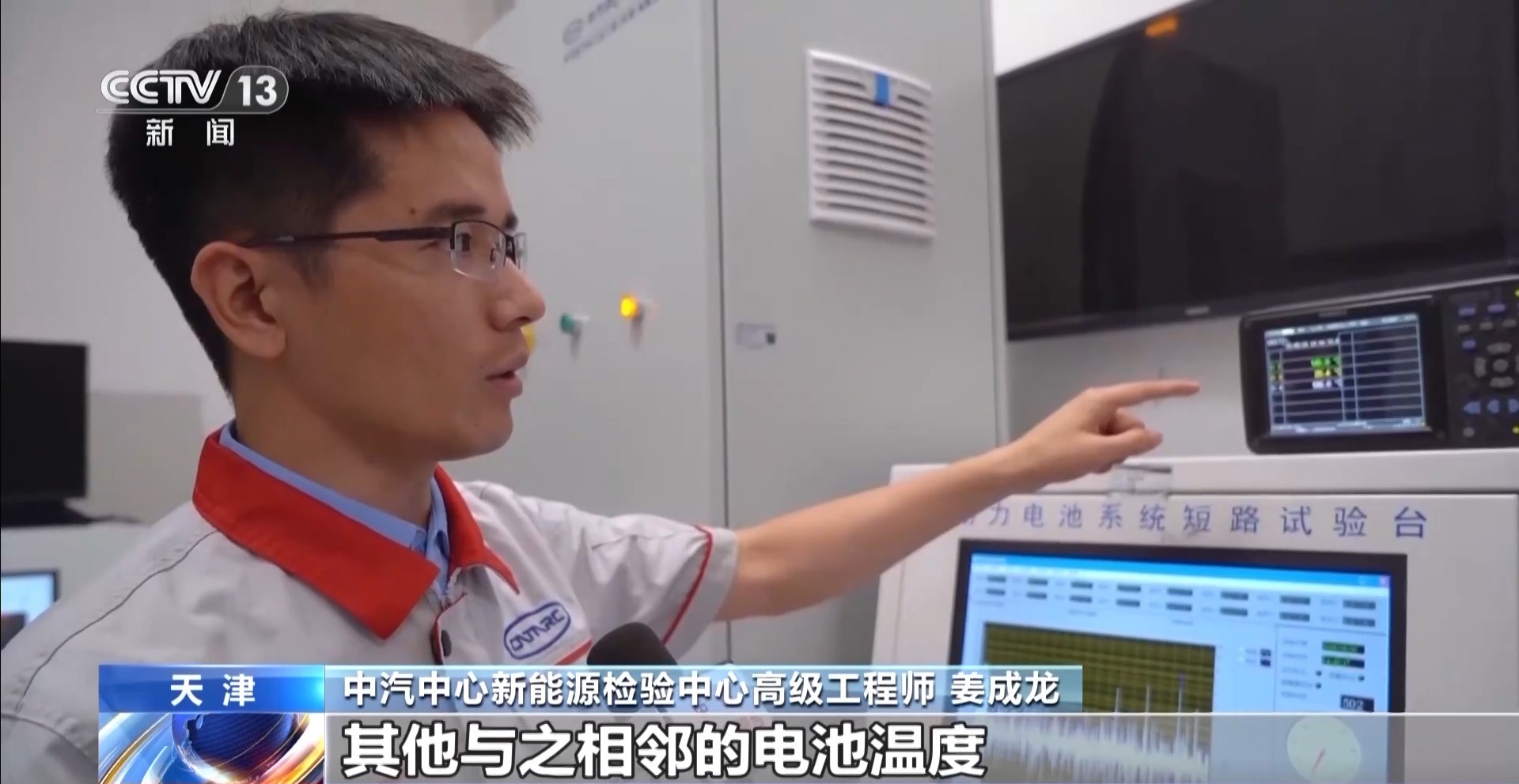 中汽中心新能源檢驗中心高級工程師 姜成龍:一般被刺電池的温度最高會升到300℃左右,電芯內部的温度可以達到1000℃左右。在這個過程當中,其他與之相鄰的電池的温度也會有相應的上升,但擴散的過程中,整個電池系統不能起火、不能爆炸。
