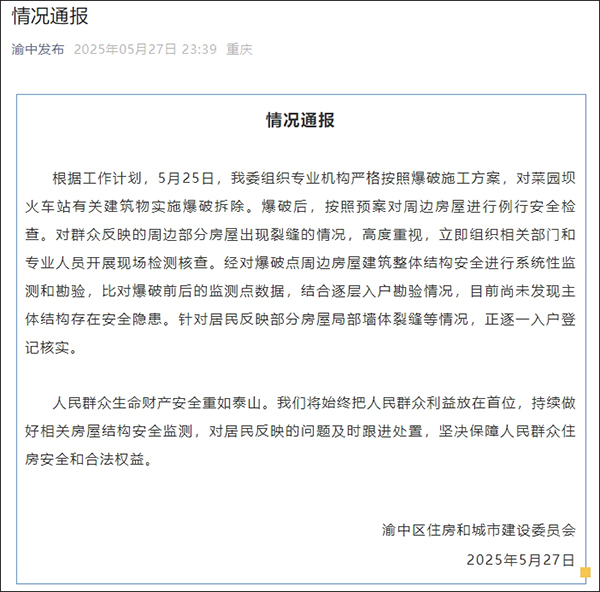 據重慶市渝中區微信公眾號“渝中發佈”消息,5月27日,渝中區住房和城市建設委員會發布情況通報稱,根據工作計劃,5月25日,我委組織專業機構嚴格按照爆破施工方案,對菜園壩火車站有關建築物實施爆破拆除。爆破後,按照預案對周邊房屋進行例行安全檢查。對羣眾反映的周邊部分房屋出現裂縫的情況,高度重視,立即組織相關部門和專業人員開展現場檢測核查。經對爆破點周邊房屋建築整體結構安全進行系統性監測和勘驗,比對爆破前後的監測點數據,結合逐層入户勘驗情況,目前尚未發現主體結構存在安全隱患。針對居民反映部分房屋局部牆體裂縫等情況,正逐一入户登記核實。