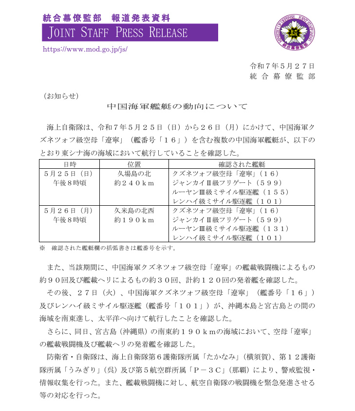 統合幕僚監部表示,5月25日遼寧戰鬥羣位久場島以北約240公里處;26日遼寧戰鬥羣位久米島西北約190公里處;27日遼寧艦(16)與055型導彈驅逐艦南昌艦(101)經沖繩本島與宮古島間海域向東南航行進入太平洋。統合幕僚監部表示方面表示,在宮古島(衝縄縣)東南約190公里海域發現遼寧艦艦載戰鬥機及直升機進行起降作業。