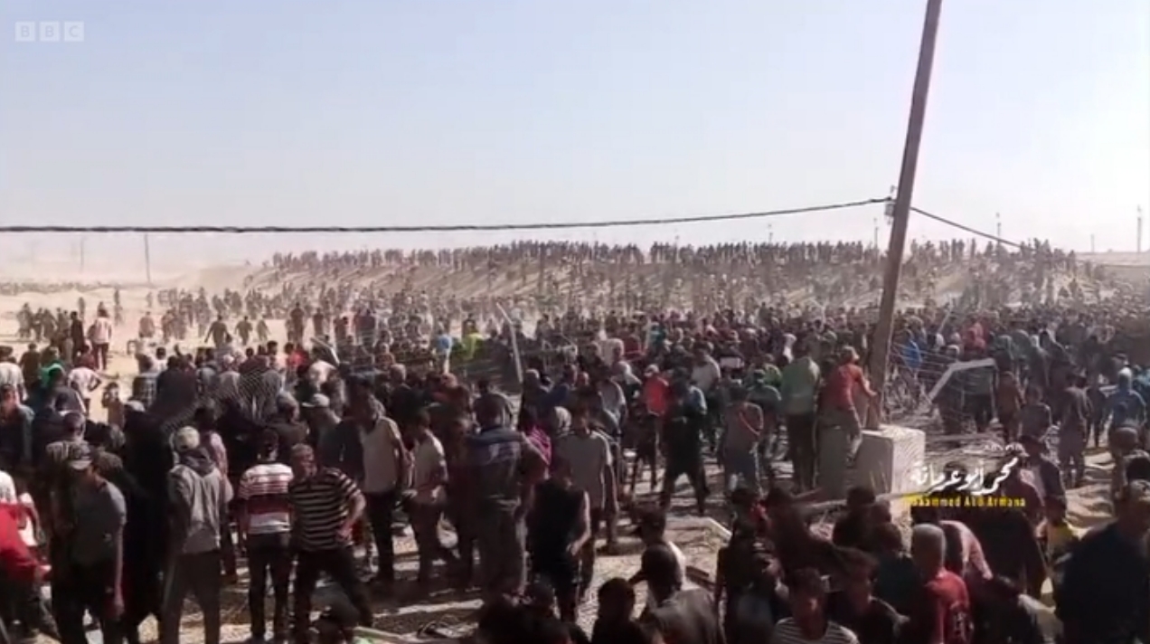 幾乎在同一時間,以色列和巴勒斯坦媒體分享了巴勒斯坦人在塔爾·蘇爾坦社區排長隊的照片。但就在一個多小時後,他們開始發佈視頻,其中顯示,成千上萬的男人、女人和兒童湧入。其中一段視頻中,似乎是槍聲響起,一些人在奔跑和躲避。