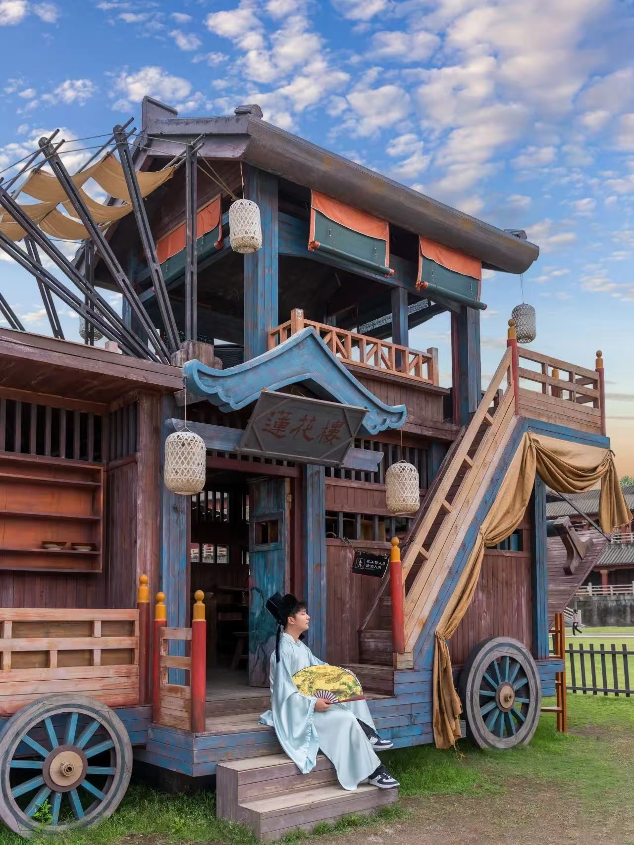 一名遊客身着道具服裝拍照。橫店影視城
