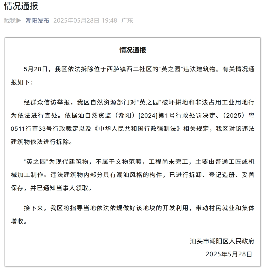 廣東汕頭通報“英之園”被拆除:不屬於文物範疇,將指導當地開發利用