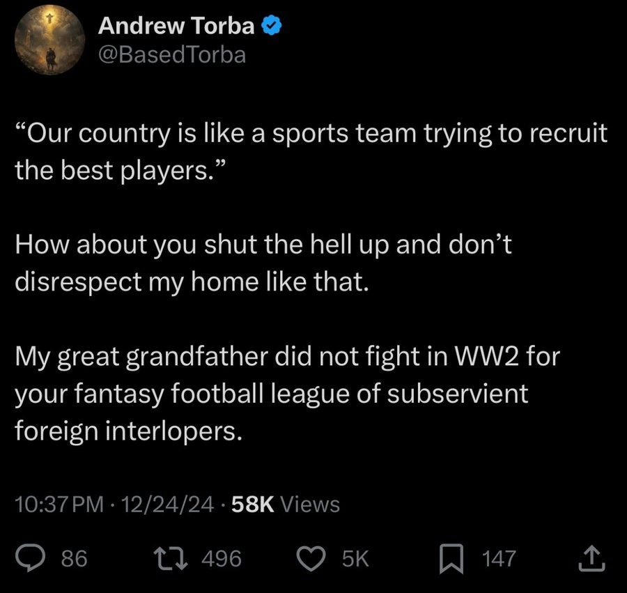 “我們的國家是足球隊?你可快TM閉嘴吧,別侮辱我的祖國。我的曾祖父在二戰中為國征戰,可不是為了你那個幻想的由順從的外國入侵者組成的足球隊。”