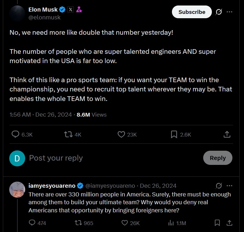 比如馬斯克在X上鼓吹外國人才不是太多而是太少,招募外國人才就跟球隊一樣,不問來源儘可能招募優秀人才才能贏,下面幾乎全是嘲諷他的評論: