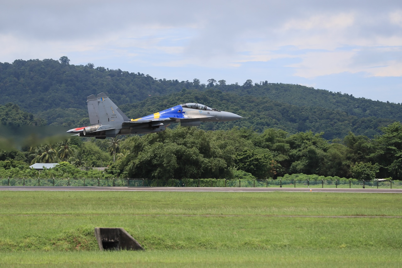 甚至有人傳説駕駛蘇-30MKM上天表演的是馬來西亞空軍司令。要真是他,那就更下血本了。蘇-30MKM的飛行動作雖然很漂亮,也將飛行表演的重點放在落葉飄、尾衝等過失速機動,但沒有像博格丹在珠海那樣,表演超短滑跑後就旱地拔葱。畢竟蘇-30MKM推重比沒有那麼變態,而且飛行員的飛行技藝也沒有那麼變態。