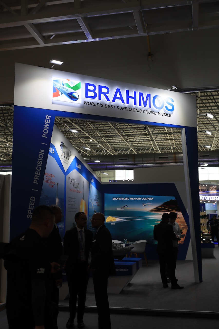 最有意思的展台是在珠海絕對看不到的,在其他地方也不一定能看到的印度展台。筆者遠遠就看到其大大的標誌:Brahmos,world‘s best supersonic cruise missile(布拉莫斯,全球最好的超音速巡航導彈)。看到這句話時,筆者就很想問問印巴衝突期間“布拉莫斯”導彈做布朗運動的事,只不過再一想,這樣不好。