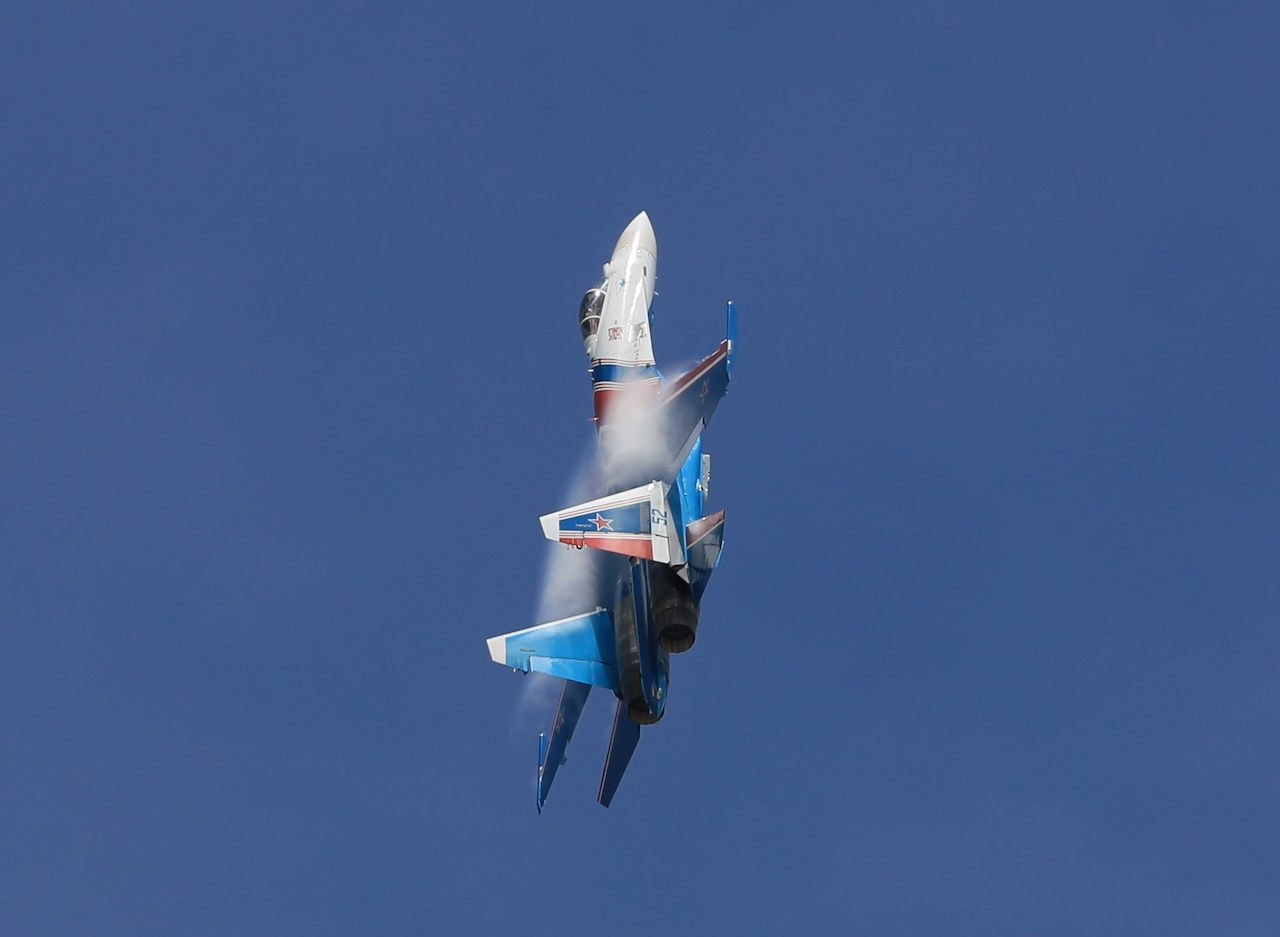 蘭卡威與珠海最大的不同是天氣:蘭卡威雖然雨大,但雨過會天晴。在藍天白雲的襯托下,“俄羅斯勇士”的藍白紅塗裝格外奪目。空氣中水汽依然很大,蘇-35在開加力對沖後爬升時,我們可以明顯看到機翼上的水汽。這不是超音速造成的,而是機翼上下的壓力差導致的。