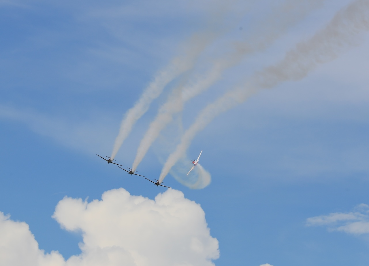 相比於採用噴氣式教練機和9機編隊的加拿大“雪鳥”飛行表演隊,“朱庇特”的飛行表演四平八穩,編隊也比較鬆散。不過4架KT-1B在拉煙中小半徑頭尾銜接地水平盤旋,倒是有幾分二戰中空中格鬥的味道。