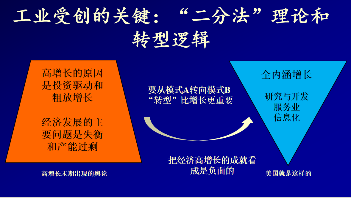 為了否定高增長,他們把為高增長立下“汗馬功勞”的中國工業體系一刀切分為二:第一個部分是佔工業增加值約90%的傳統工業,屬於不應該再發展的“舊動能”;第二個部分是應該成為未來發展重點的科研活動、信息化和服務業,因為他們看到的美國產業結構就是這樣的。因此,“二分法”思維認為中國經濟的中心問題是不再是增長,而是從以第一個部分為主的產業結構轉為以第二個部分為主的“轉型”。實際上,“二分法”是一種反工業化的思潮。