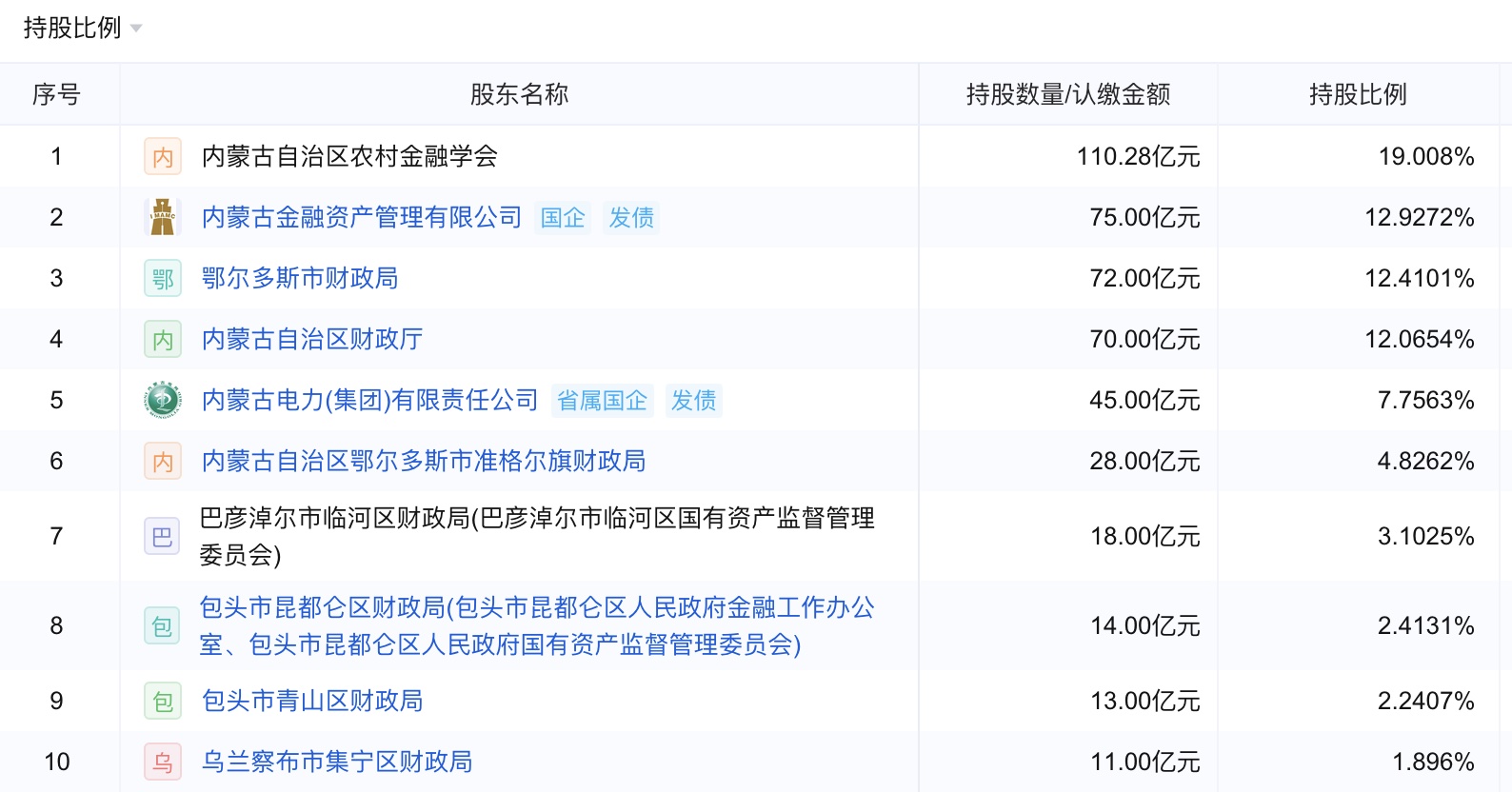 在股權結構方面,內蒙古農商銀行呈現出以國有資本為主導、地方財政和大型國有企業共同參與的多元化格局。主要股東及持股情況為:內蒙古自治區農村金融學會認繳出資110.28億元,持股19%,為第一大股東;內蒙古資產管理有限公司認繳出資75億元,持股12.927%;鄂爾多斯市財政局認繳出資72億元,持股12.41%;內蒙古自治區財政廳認繳出資70億元,持股12.0654%;內蒙古電力(集團)有限責任公司認繳出資45億元,持股7.7563%。其餘股份由區內其他旗縣財政局及部分企業法人持有。