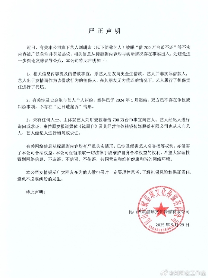 近日,有關本公司旗下藝人劉畊宏(以下簡稱藝人)被曝“借700萬台幣不還”等不實內容被廣泛關注並引發熱議,相關信息從標題到內容均與實際情況存在事實出入。為避免進