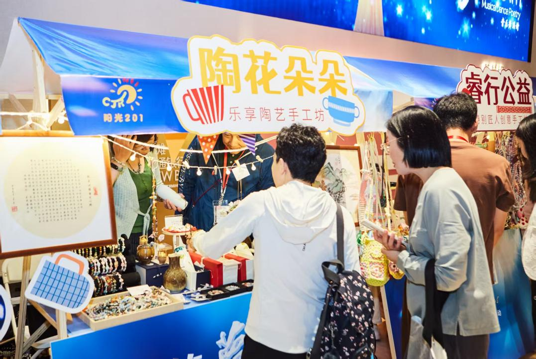 與劇場內的藝術盛宴同步,“築夢向陽”殘健融合公益市集在交通銀行前灘31演藝中心大劇場前廳温暖開市。市集以“展非遺技藝、促殘健共融”為主題,匯聚了12家殘疾人工作室及社會公益組織的匠心之作。碧卿文化工作室的海派繡球龍以五米長龍串聯非遺技藝與現代設計,寓意團圓美滿;上海藝助行公益促進中心的竹絲扣瓷作品,竹絲藏於瓷器肌理,展現指尖上的東方智慧……