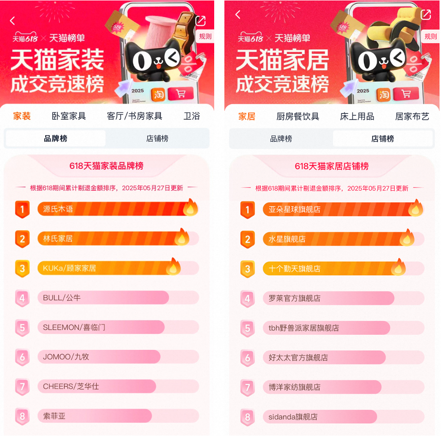 家居領域,亞朵星球在新品深睡夏涼被2.0、深睡枕2.0等千萬單品的加持下,首次登頂天貓家居榜和牀品榜TOP1,為睡眠賽道帶來新的活力。十個勤天憑藉粉絲效應,通過田園舒適的直播場景,單日直播超8千萬,成為此次618開門紅的黑馬店鋪,首次登頂家居榜TOP3。