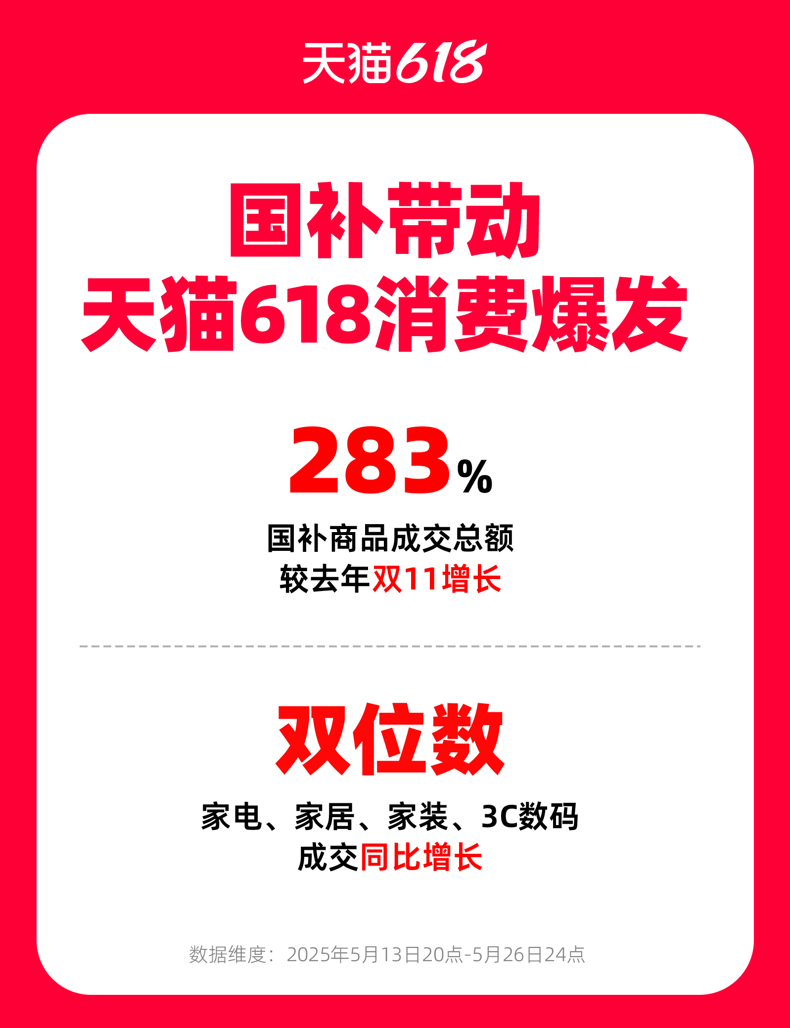截至5月26日,天貓618第一階段,參加國補的家電家裝、手機數碼等品類成交總額較去年雙11增長283%,美的、海爾、科沃斯、源氏木語等40個品牌成交破億;帶動家電、家居、家裝、3C數碼等行業整體成交同比雙位數增長,超3000個品牌同比成交翻倍,釋放出強勁的消費活力。