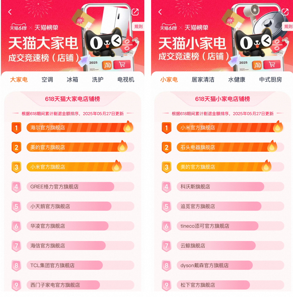 大家電店鋪成交排行榜中,海爾官方旗艦店位居榜首,美的、小米、格力、小天鵝官方旗艦店緊隨其後;小米官方旗艦店拿下小家電店鋪銷售榜榜首,石頭、美的、科沃斯、追覓旗艦店名列第二名至第五名。