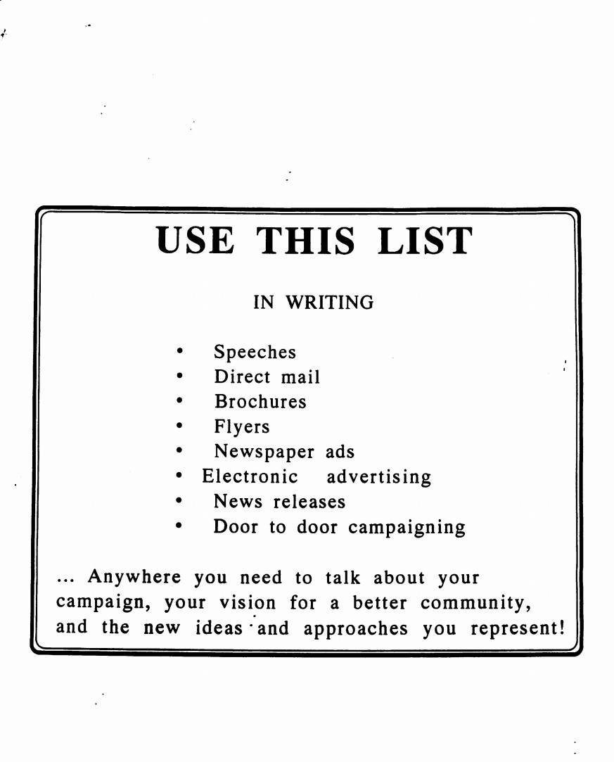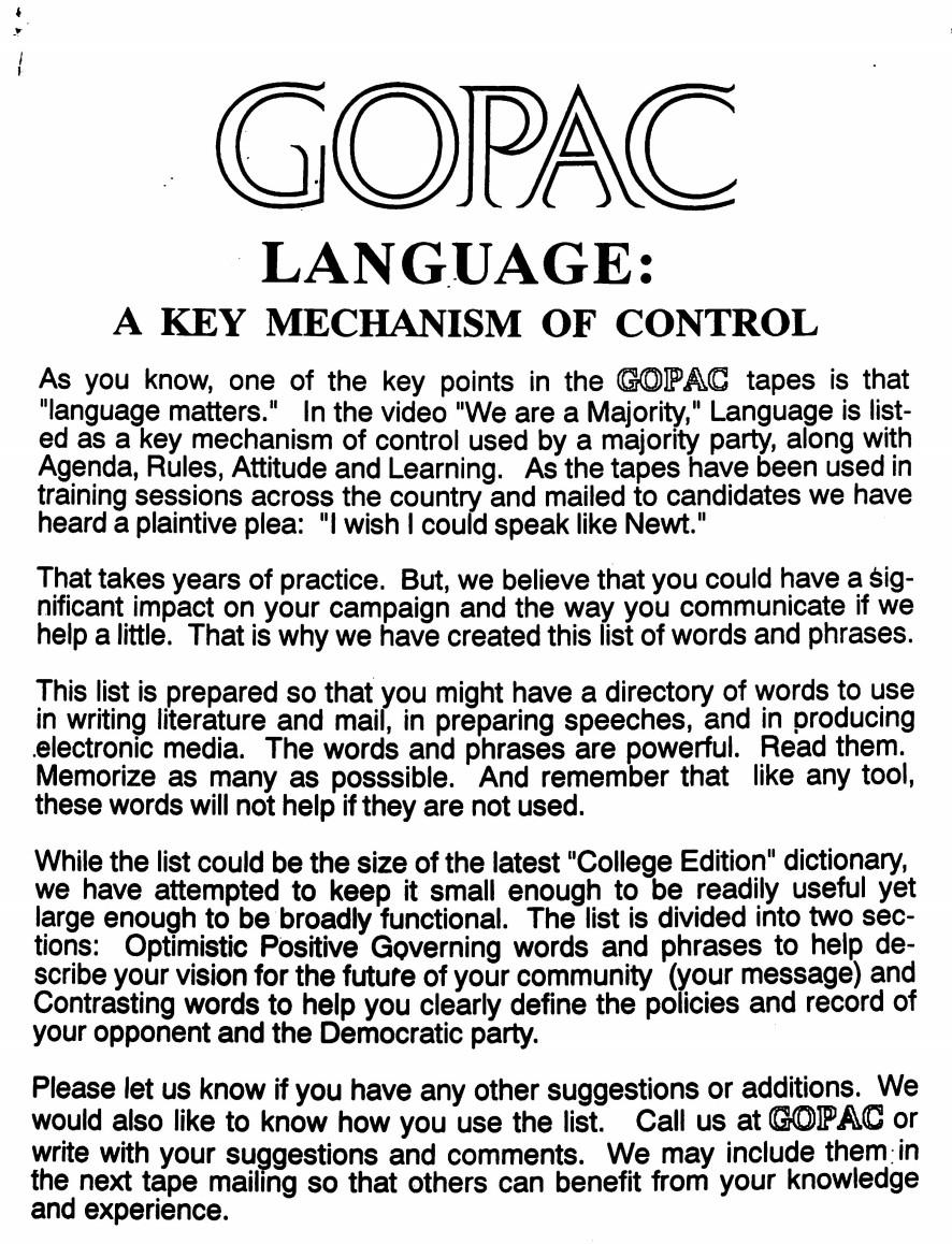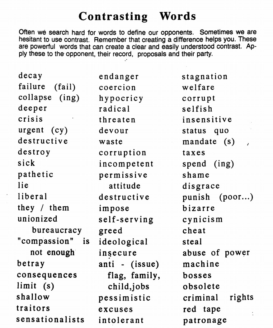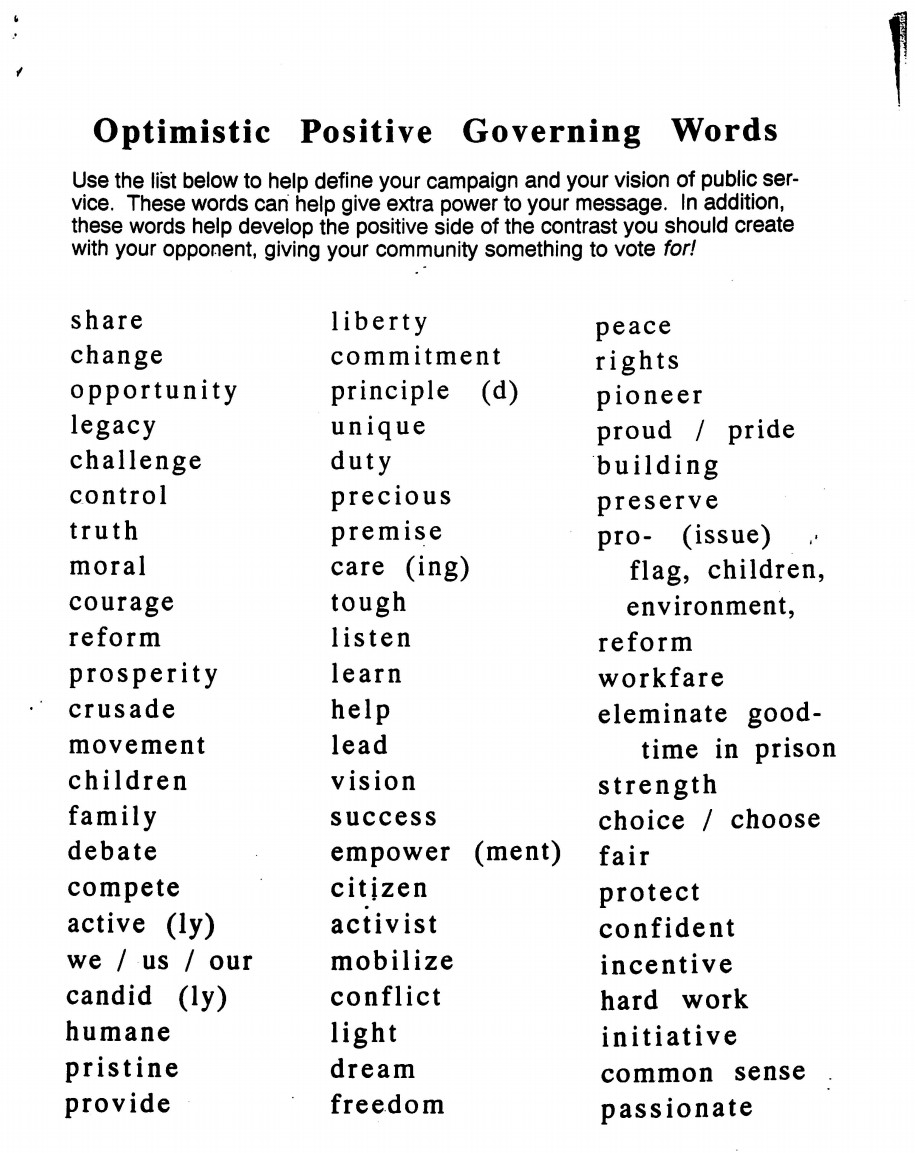 這個只有四頁的小冊子強調了語言的重要性,給那些希望模仿金裏奇,像金裏奇一樣能言善辯的有志共和黨人,提供了一個小抄。這個小抄上面列舉了用來讚頌自己的“Optimistic Positive Governing Words”,也列出了用來攻擊對手的“Contrasting Words”。