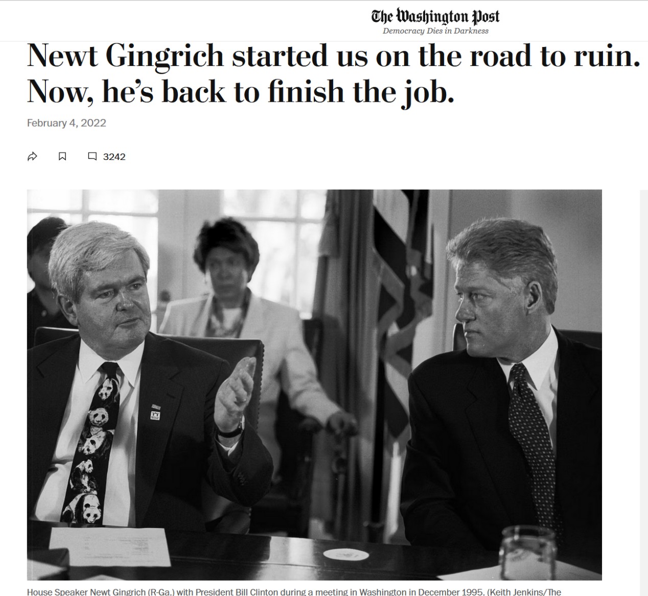 如果你今天去搜有關金裏奇的評論,很多美國主流媒體和學者會把他視為毒害美國政治至今的罪魁禍首——比如華盛頓郵報的這篇文章,標題是《金裏奇帶我們走上了毀滅的道路,現在他要回來完成這項任務》: