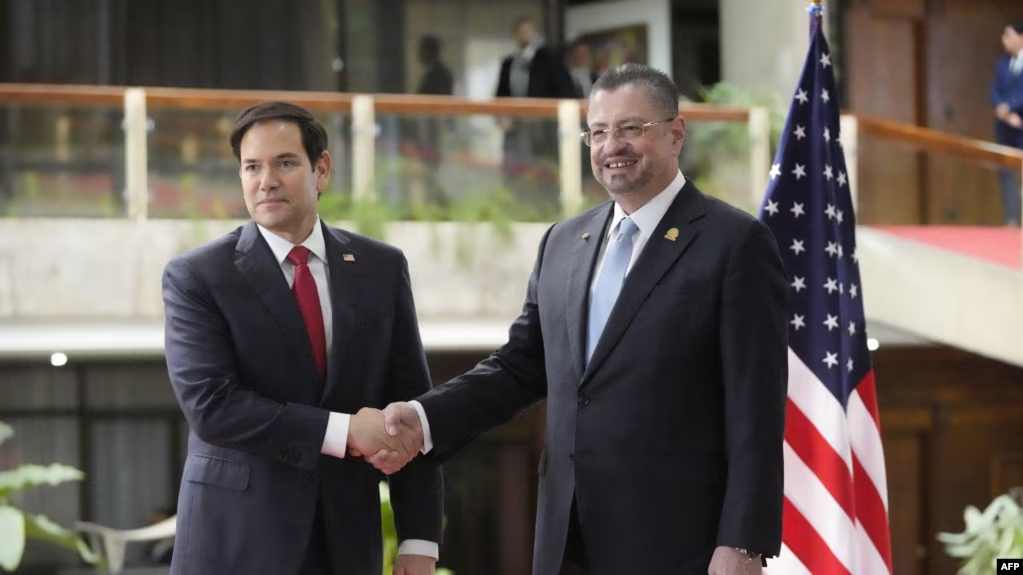 美國國務卿魯比奧在聯合記者會上與哥斯達黎加總統查韋斯握手。