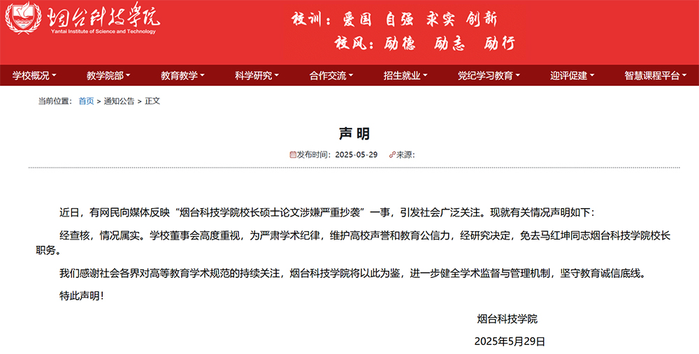 經查核,情況屬實。學校董事會高度重視,為嚴肅學術紀律,維護高校聲譽和教育公信力,經研究決定,免去馬紅坤同志煙台科技學院校長職務。