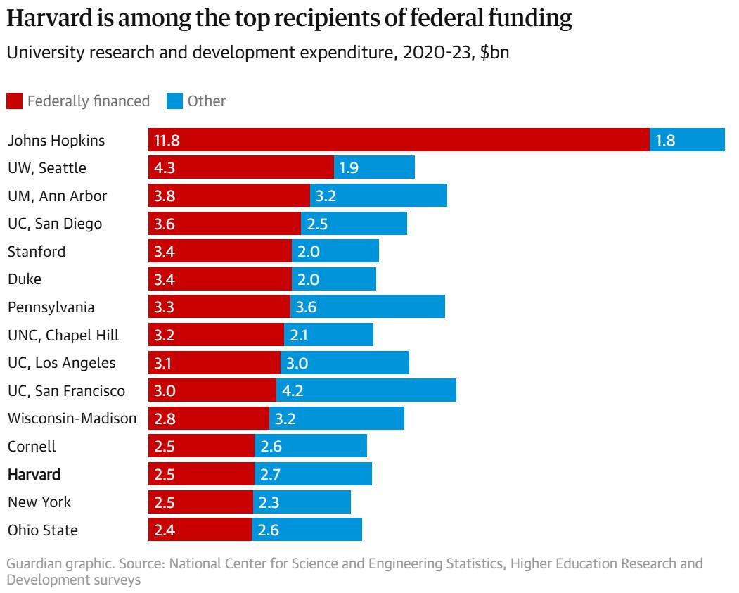 根據官方數據,哈佛大學在2024年財年,聯邦資助的研究經費總額為6.86億美元,佔該校所有受資助研究收入的約68% 。但總體而言,聯邦資助的研究經費佔哈佛總運營收入的11%。