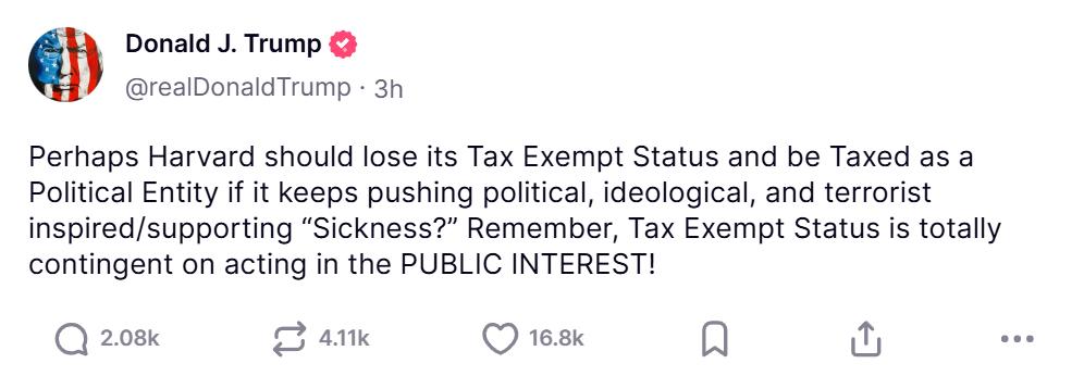 特朗普在 Truth Social 上指責哈佛大學