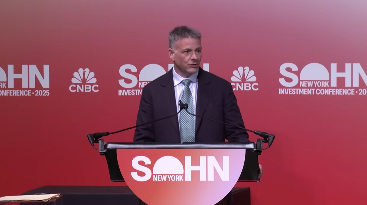 當地時間5月21日,大衞·埃因霍恩在紐約的對沖基金年度盛宴索恩投資大會上發言。索恩會議基金會視頻截圖