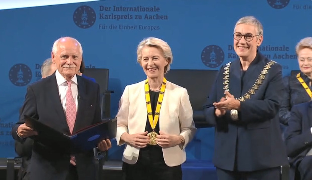 馮德萊恩當天在德國亞琛被授予查理曼獎,該獎項名稱來源於曾統一西歐和中歐大部分地區的查理曼大帝,旨在表彰促進歐洲一體化的人物。