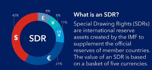 特殊提款權(SDR)不是經典意義上的金錢,而是一種資產。特別提款權的價值基於全球五大主要貨幣:美元、歐元、人民幣、日元和英鎊。