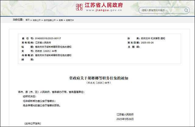 另據江蘇省人民政府網站消息,5月26日,江蘇省人民政府發佈《省政府關於胡彬郴等職務任免的通知》。經江蘇省政府研究決定,任命胡彬郴為省公安廳督察長;免去李耀光的省公安廳督察長職務。
