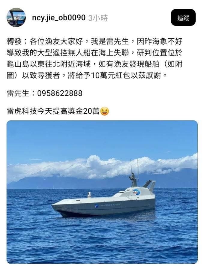 有台灣網友發現,有自稱雷先生的PO文表示,因昨海象不好,導致他們單位的大型遙控無人船在海上失聯,研判位置位於龜山島以東往北附近海域,如有漁友發現船舶(如附圖)以致尋獲者,將給予10萬元紅包以茲感謝。後又標註“雷虎科技今天提高獎金20萬”。