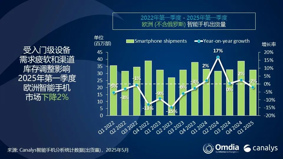 2025年開局對歐洲智能手機市場來説頗為艱難,2024年,歐洲智能手機在連續四年下滑後首次反彈,總體出貨量達1.36億部,同比增長5%。繼去年小幅復甦後,不少廠商在2024年第四季度末高估了終端需求,導致2025年第一季度時渠道庫存積壓嚴重。
