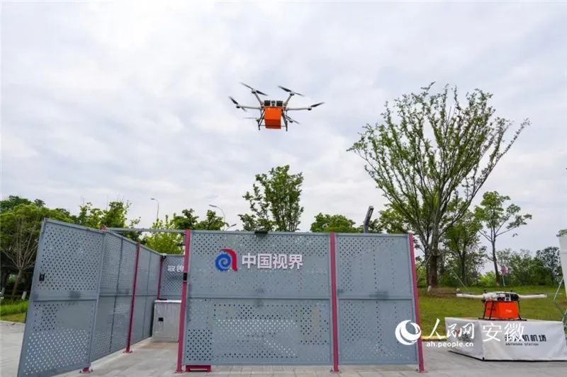 臨近中午,伴隨一陣螺旋槳轟鳴聲,合肥市包河區中國視界產業園內,一架無人機緩緩降落。幾公里外商場的一份外賣,轉瞬即達。