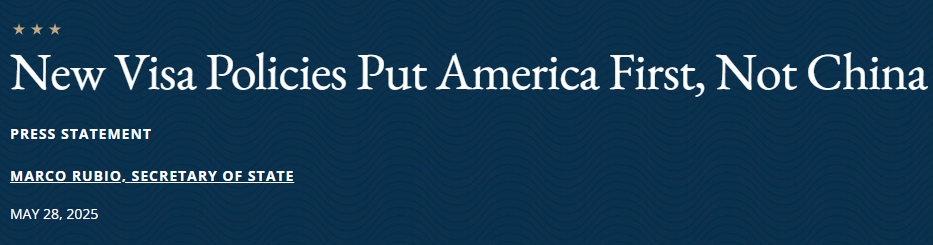 同日,美國國務院網站發佈題為“新簽證政策優先考慮美國,而非中國”的聲明,聲稱將“狠狠吊銷”中國學生的簽證,並將修改簽證標準,以加強對來自中國內地和香港的所有未來簽證申請的審查。