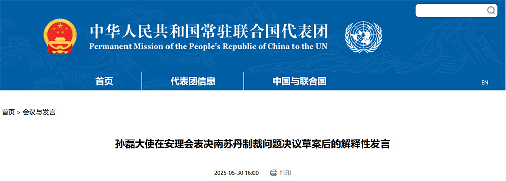 據中國常駐聯合國代表團網站消息,當地時間5月30日,中國常駐聯合國副代表孫磊在安理會表決南蘇丹制裁問題決議草案後作解釋性發言,敦促安理會早日調整或解除對南蘇丹制裁。
