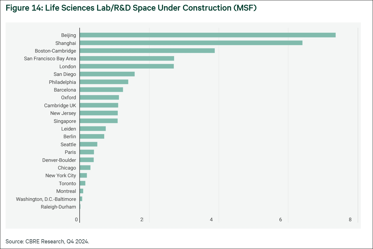 各地正在建設的生命科學實驗室/研發中心面積,按城市排名 CBRE