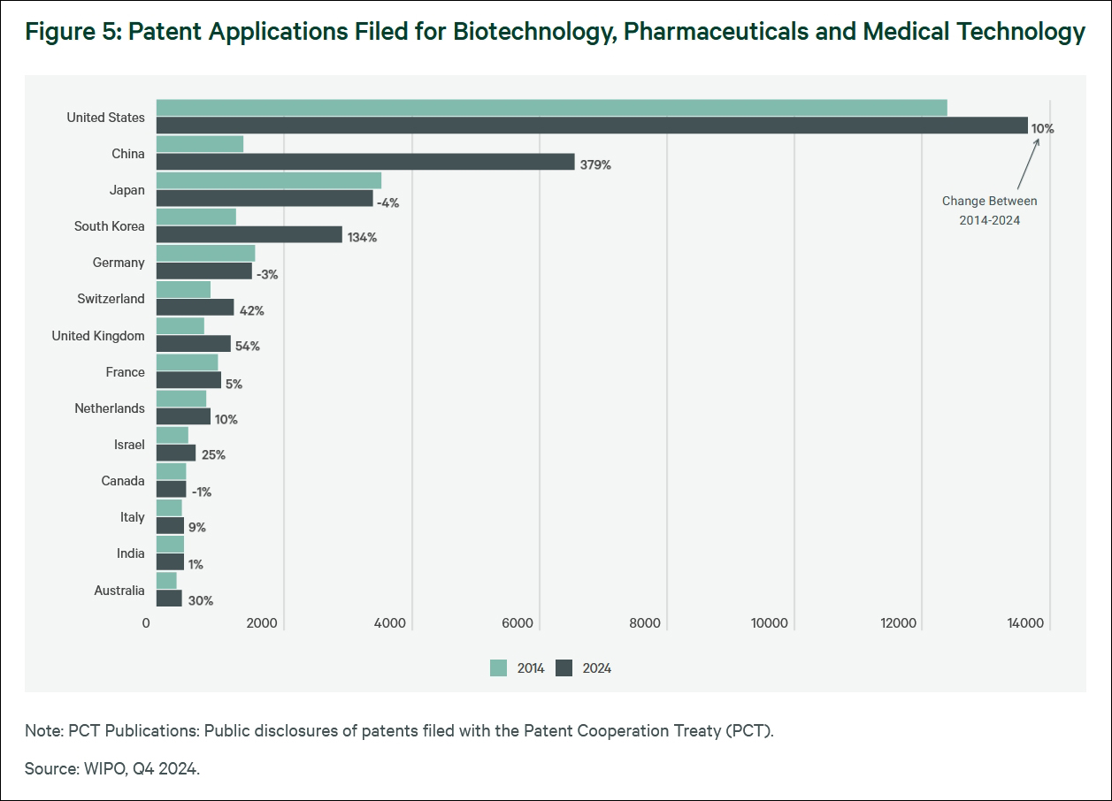 CBRE報告還發現,儘管美國在生物技術、製藥和醫療技術領域的專利申請數量上仍居全球首位,但中國正以“任何主要國家無法比擬”的速度追趕上來:自2014年以來,中國的製藥與醫療技術專利數量增長了379%。相比之下,在主要國家中專利增長速度排名第二的韓國,過去10年的增長率為134%。