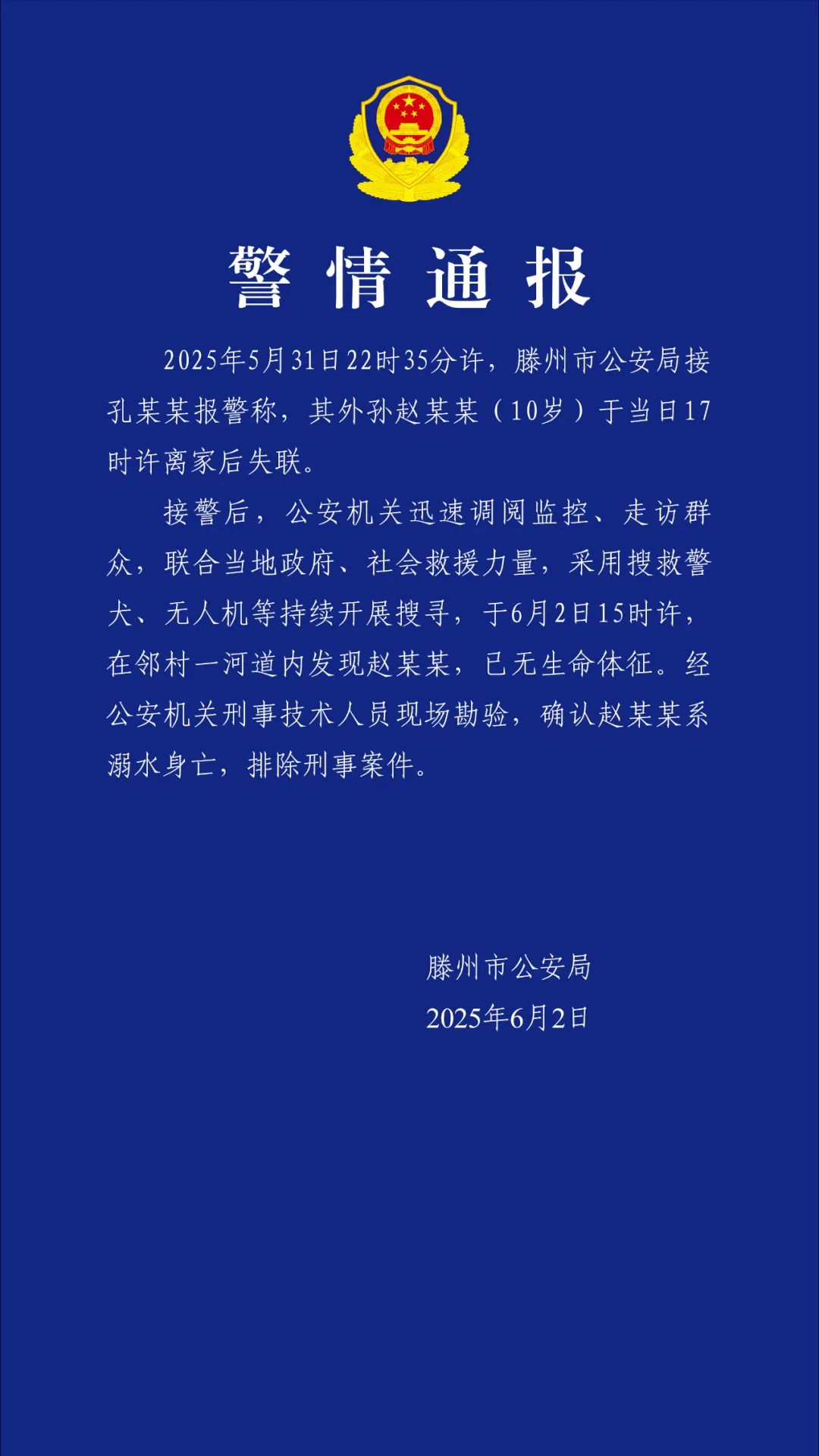 山東省滕州市公安局微信公眾號“滕州公安”6月2日發佈警情通報稱,5月31日22時35分許,滕州市公安局接孔某某報警稱,其外孫趙某某(10歲)於當日17時許離家後失聯。