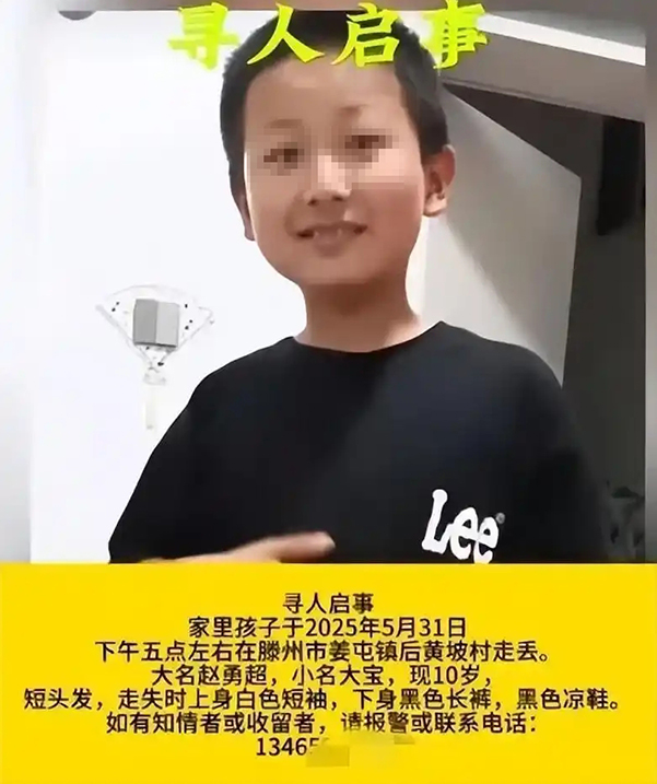 據極目新聞此前報道,6月1日,有網友發視頻稱,山東省滕州市姜屯鎮黃坡村10歲的小男孩趙某超走失,孩子家屬萬分着急,希望通過網絡社交媒體求助。