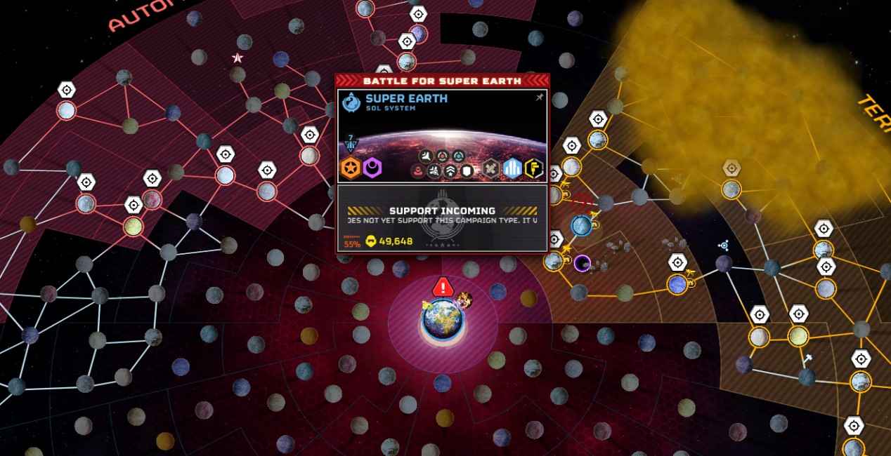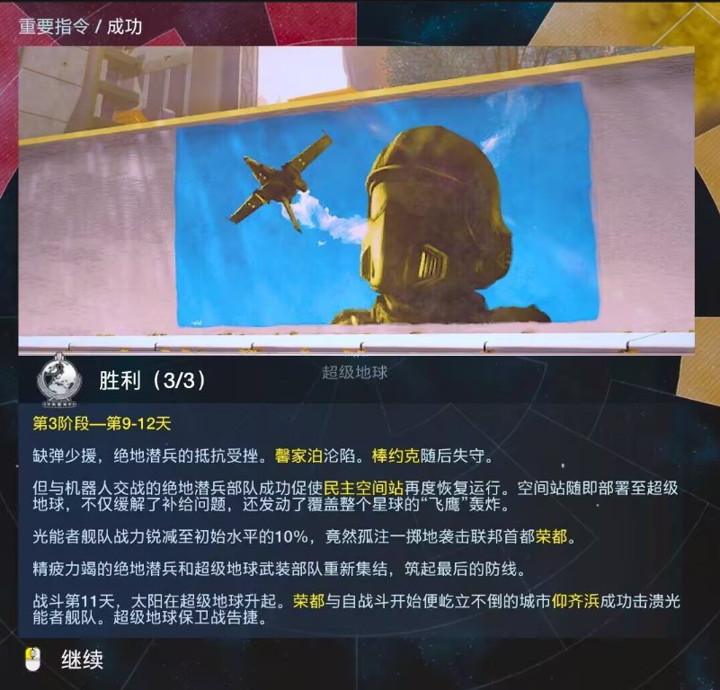 除了同時加大對三個城市的攻擊外,地球指揮部的各種指令也是真真假假,一個保護人員撤離的全球任務卡在最後2%失敗,讓玩家們的士氣大受打擊,後面另一個遠征機器人修復超級防禦兵器(dss民主空間站)的任務更讓人心生疑惑。
