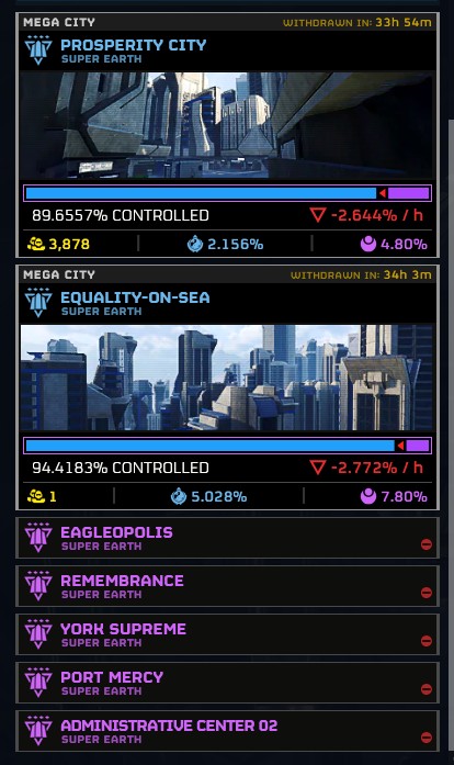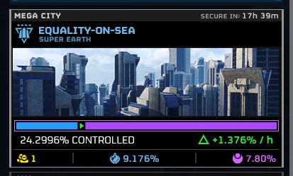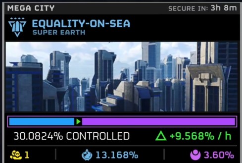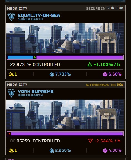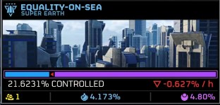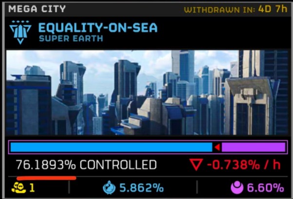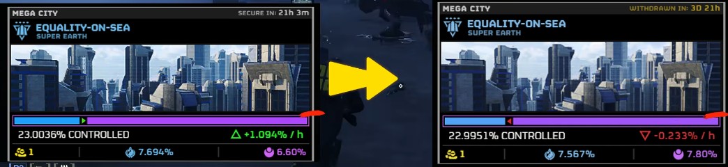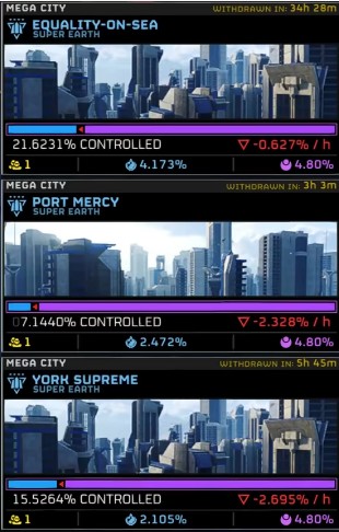 藍色百分比代表玩家(地球方)的抵抗力度,紫色百分比代表外星人的攻擊強度,兩者的差值決定城市是逐步淪陷還是逐步收復