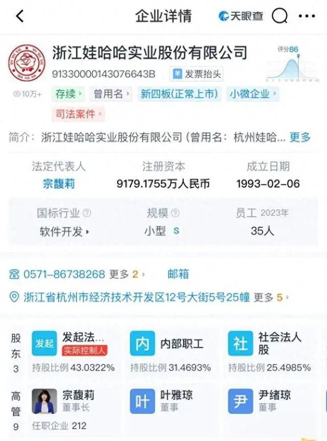 這家企業,是娃哈哈商業帝國的重要基石。公開資料顯示,浙江娃哈哈實業股份有限公司成立於1993年2月,註冊資本約9179萬人民幣,經營範圍含初級食用農產品、水產品、百貨、針紡織品、服裝、皮革製品等銷售,洗車服務,攝影服務,健康管理服務,物業管理等。