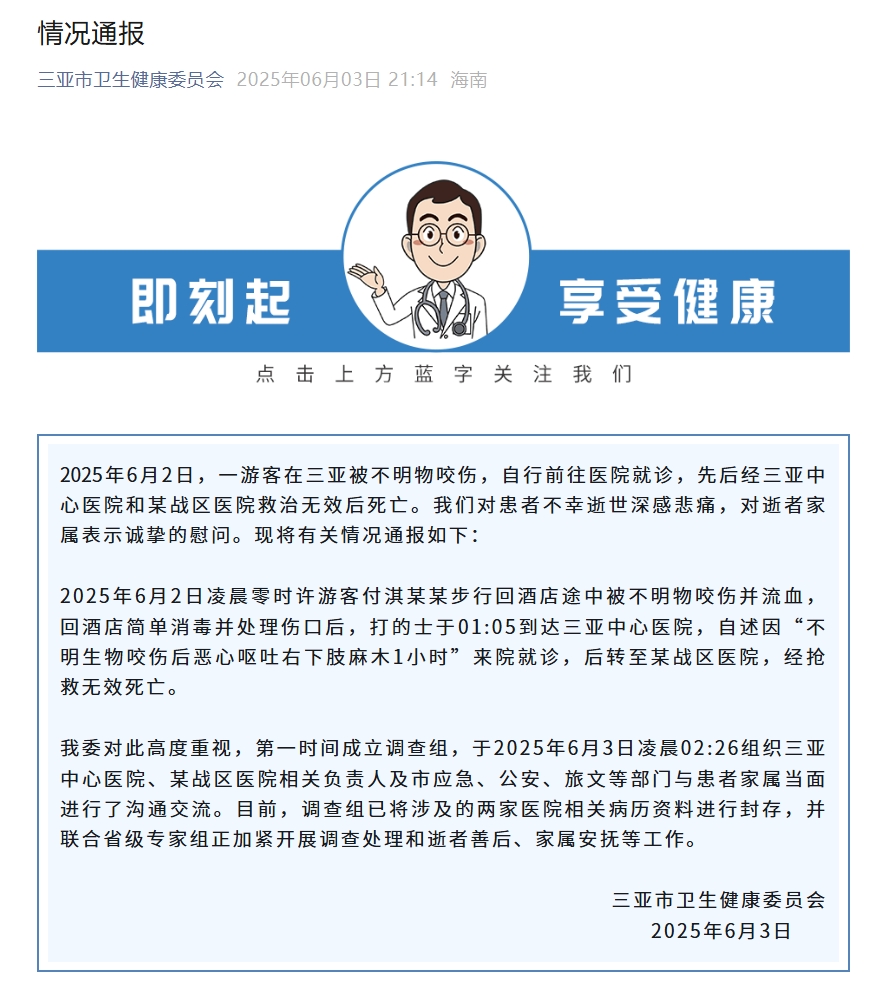 2025年6月2日,一遊客在三亞被不明物咬傷,自行前往醫院就診,先後經三亞中心醫院和某戰區醫院救治無效後死亡。我們對患者不幸逝世深感悲痛,對逝者家屬表示誠摯的慰問。現將有關情況通報如下: