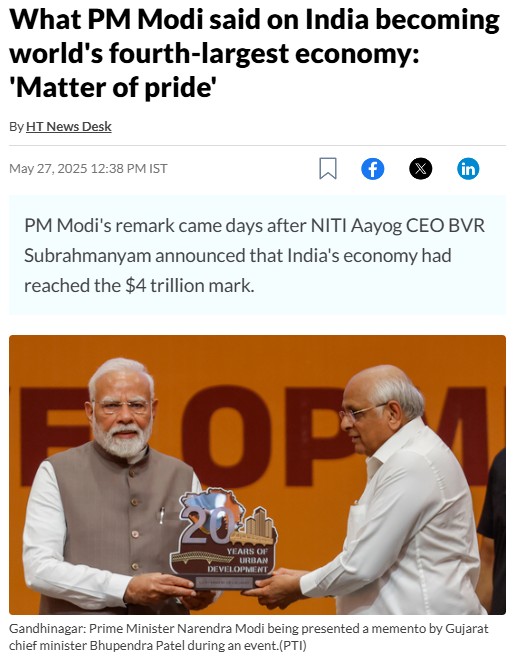 5月27日,印度總理莫迪正式提出,印度超過日本成為第四大經濟體。稍早前的5月24日,印國家轉型委員會首席執行官蘇布拉馬尼亞姆(Subrahmanyam)宣佈,印度經濟已達到4萬億美元大關。這引用的是IMF的數據,實際是IMF在4月的經濟展望中預計,印度2025-2026財年名義GDP將達到4.187萬億美元,略高於日本的4.186萬億美元。